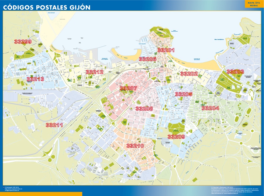 Gijon códigos postales. El mapa se imprime en papel FOTOGRÁFICO especial de cartografía de 200 grs, y se envía, gratis, a la península y Baleares, en un tubo de cartón. Dispone de diversos acabados que puede ver en las opciones de compra del mapa.