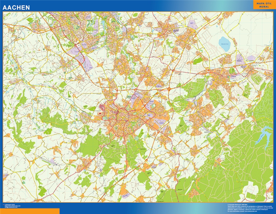 Mapa Aachen en Alemania gigante para pared. Tamaño del mapa es 150 cm en su lado más corto. El otro lado del mapa es proporcional mayor. Es el mapa más grande del mercado en una pieza.