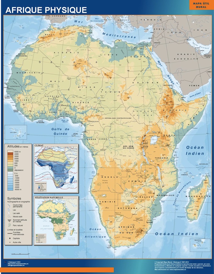 Mapa de África con fondo físico y las curvas de nivel con colores para ver las montañas y zonas bajas africanas. El mapa se imprime en papel FOTOGRÁFICO especial de cartografía de 200 grs, y se envía, gratis, a la península y Baleares, en un tubo de cartón. Dispone de diversos acabados que puede ver en las opciones de compra del mapa.