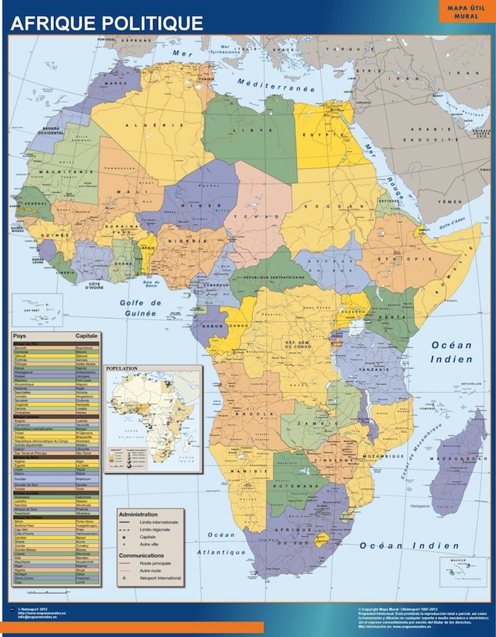 Mapa del continente de África con sus más de 50 países. El mapa se imprime en papel FOTOGRÁFICO especial de cartografía de 200 grs, y se envía, gratis, a la península y Baleares, en un tubo de cartón. Dispone de diversos acabados que puede ver en las opciones de compra del mapa.