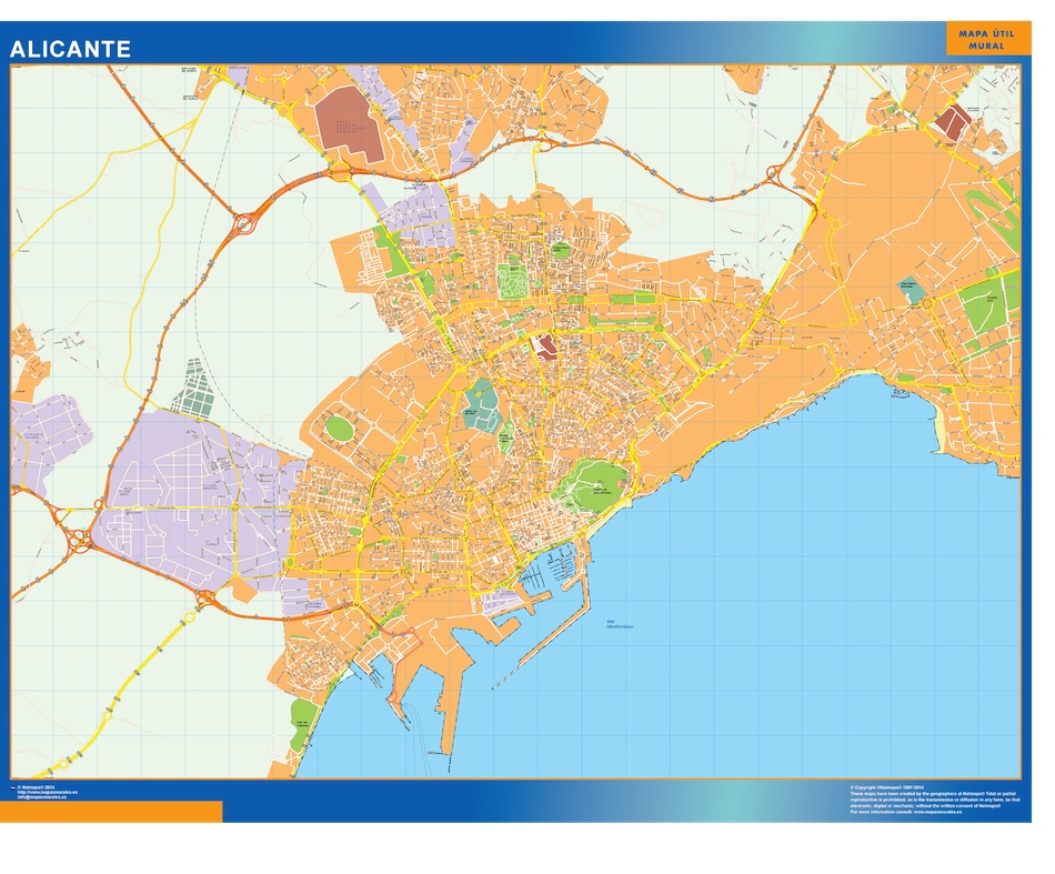 Mapa Alicante callejero gigante para pared. Tamaño del mapa es 150 cm en su lado más corto. El otro lado del mapa es proporcional mayor. Es el mapa más grande del mercado en una pieza.