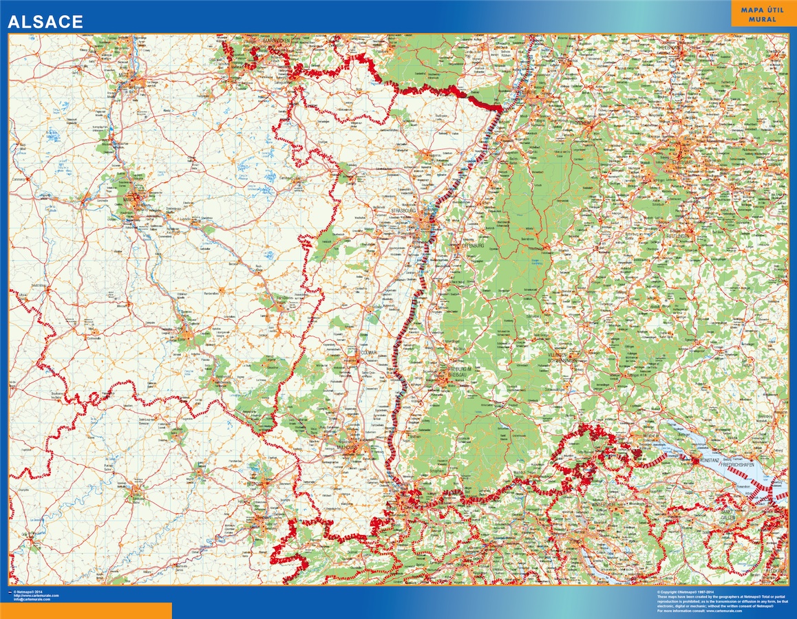 Mapa Alsace en Francia. El mapa se imprime en papel FOTOGRÁFICO especial de cartografía de 200 grs, y se envía, gratis, a la península y Baleares, en un tubo de cartón. Dispone de diversos acabados que puede ver en las opciones de compra del mapa.