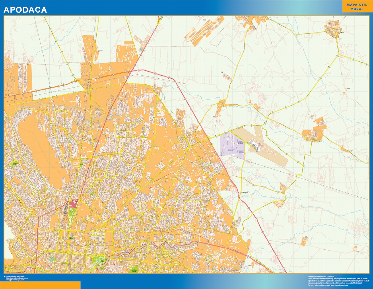 Mapa Apodaca en Mexico gigante para pared. Tamaño del mapa es 150 cm en su lado más corto. El otro lado del mapa es proporcional mayor. Es el mapa más grande del mercado en una pieza.