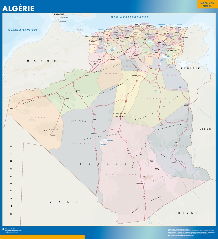 Mapa Argelia gigante para pared. Tamaño del mapa es 150 cm en su lado más corto. El otro lado del mapa es proporcional mayor. Es el mapa más grande del mercado en una pieza.