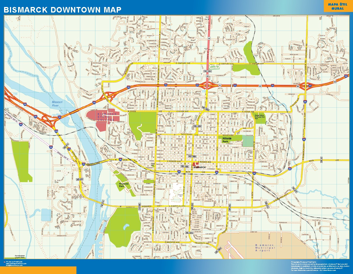 Mapa Bismarck downtown. El mapa se imprime en papel FOTOGRÁFICO especial de cartografía de 200 grs, y se envía, gratis, a la península y Baleares, en un tubo de cartón. Dispone de diversos acabados que puede ver en las opciones de compra del mapa.