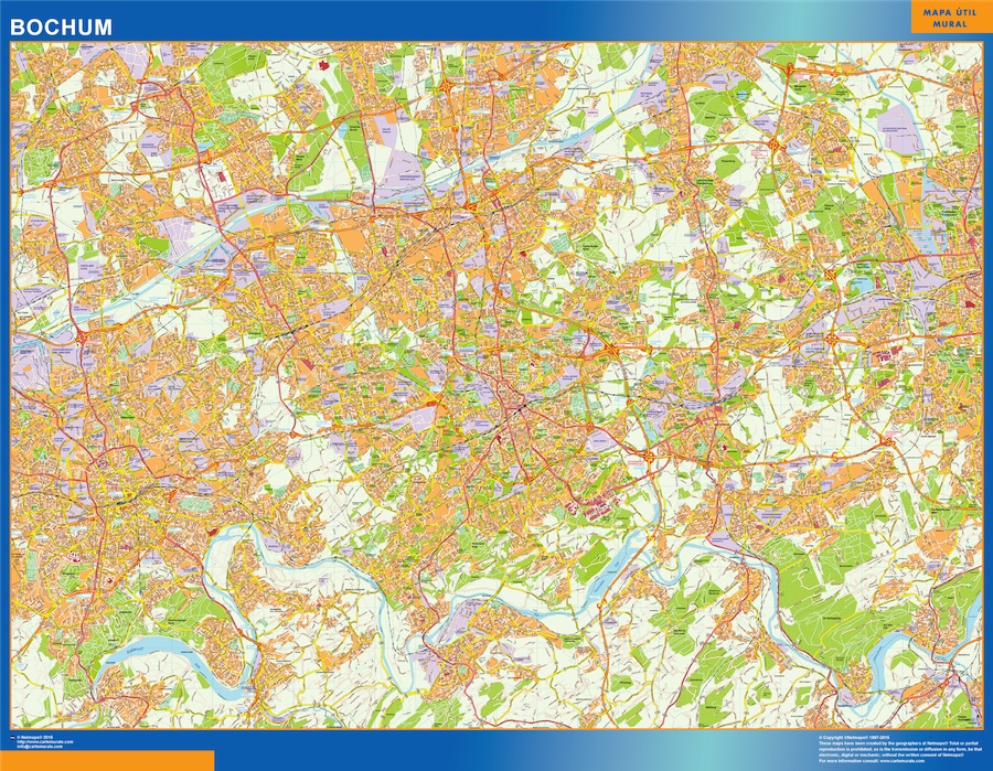 Mapa Bochum en Alemania gigante para pared. Tamaño del mapa es 150 cm en su lado más corto. El otro lado del mapa es proporcional mayor. Es el mapa más grande del mercado en una pieza.