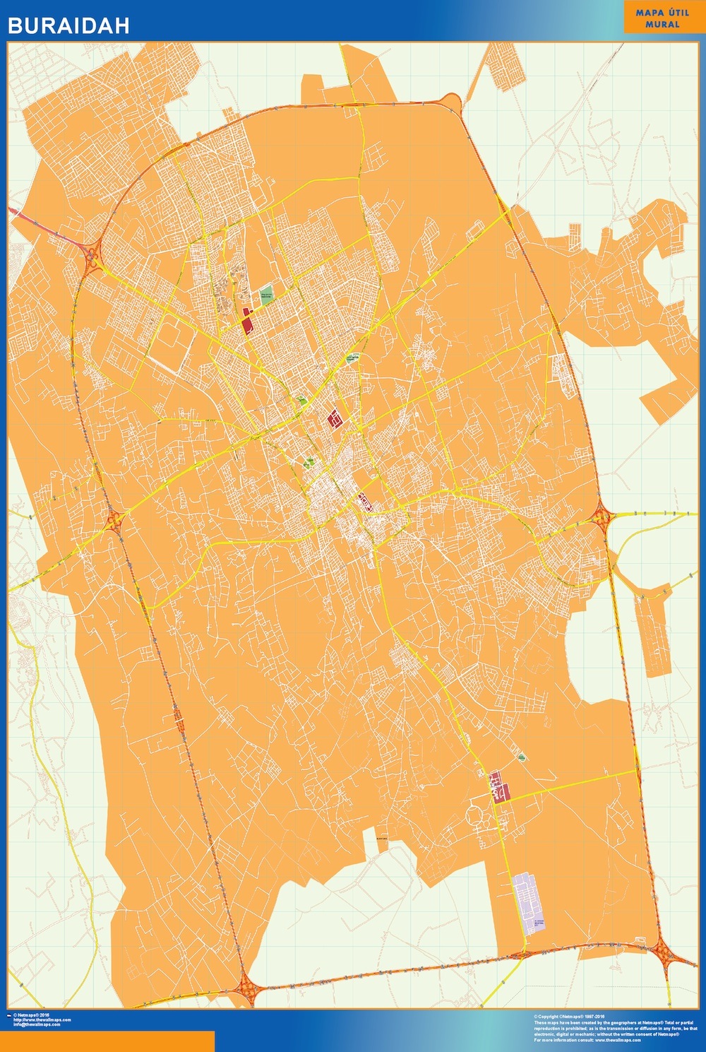 Mapa Buraidah en Arabia Saudita gigante para pared. Tamaño del mapa es 150 cm en su lado más corto. El otro lado del mapa es proporcional mayor. Es el mapa más grande del mercado en una pieza.