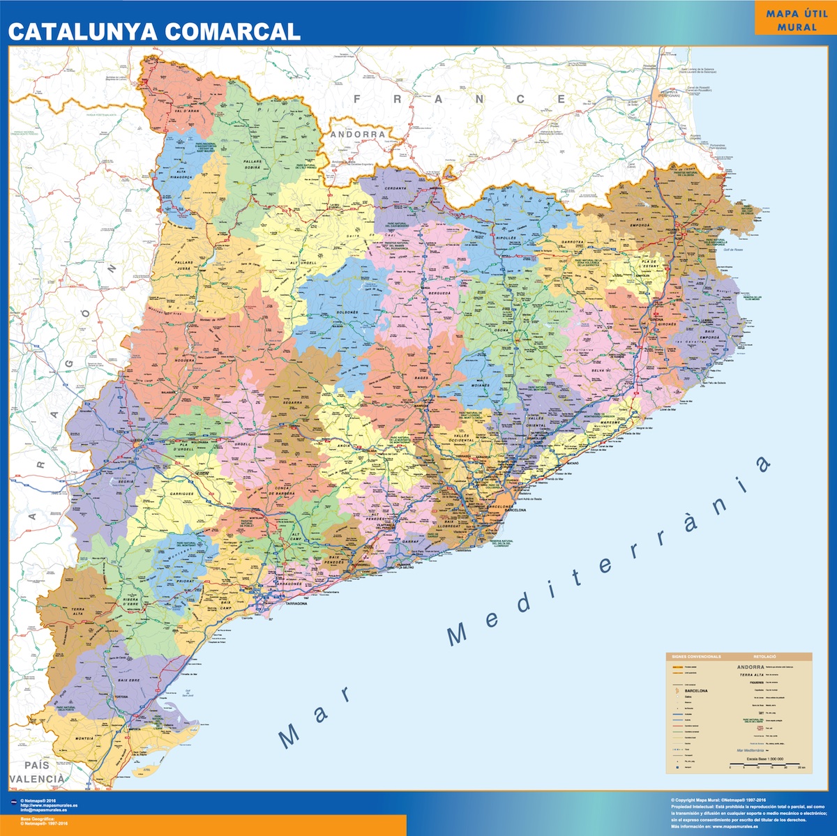 Mapa Cataluña comarcal. El mapa se imprime en papel FOTOGRÁFICO especial de cartografía de 200 grs, y se envía, gratis, a la península y Baleares, en un tubo de cartón. Dispone de diversos acabados que puede ver en las opciones de compra del mapa.