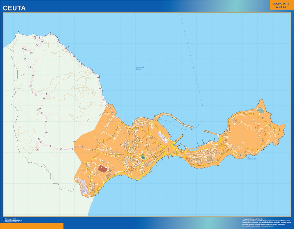 Mapa Ceuta callejero. El mapa se imprime en papel FOTOGRÁFICO especial de cartografía de 200 grs, y se envía, gratis, a la península y Baleares, en un tubo de cartón. Dispone de diversos acabados que puede ver en las opciones de compra del mapa.