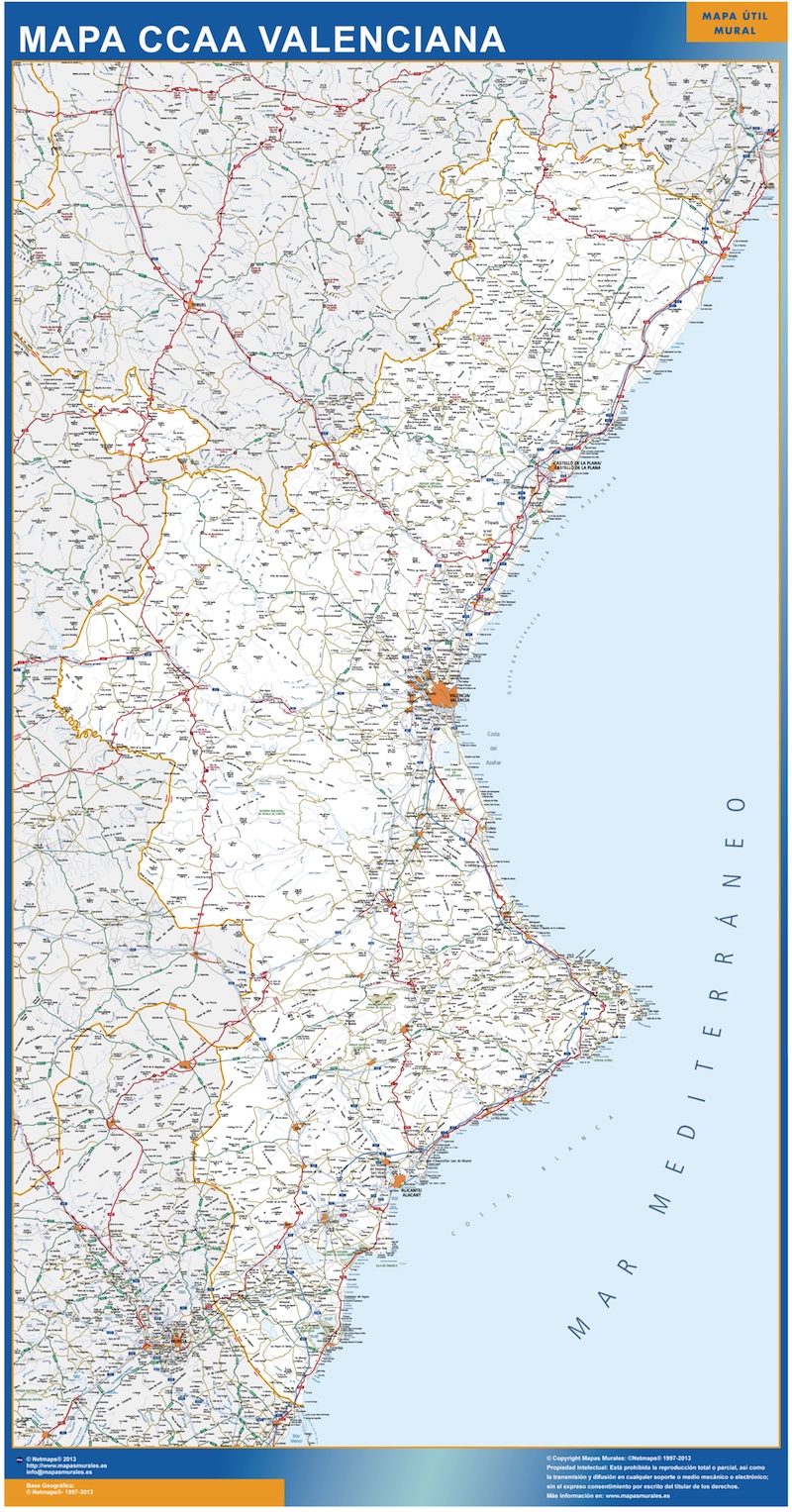 Mapa Comunitat Valenciana carreteras gigante para pared. Tamaño del mapa es 150 cm en su lado más corto. El otro lado del mapa es proporcional mayor. Es el mapa más grande del mercado en una pieza.
