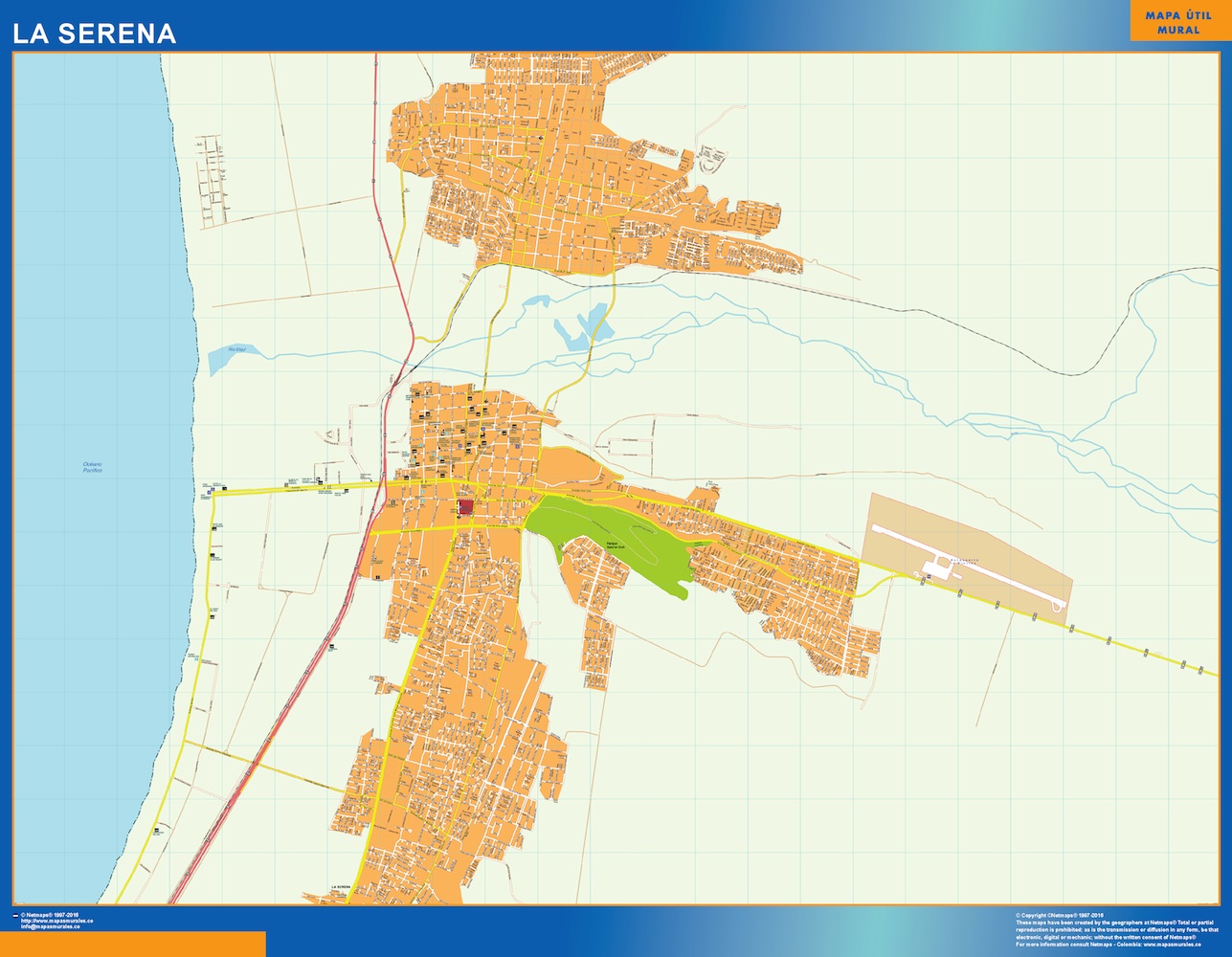Mapa de La Serena en Chile. El mapa se imprime en papel FOTOGRÁFICO especial de cartografía de 200 grs, y se envía, gratis, a la península y Baleares, en un tubo de cartón. Dispone de diversos acabados que puede ver en las opciones de compra del mapa.