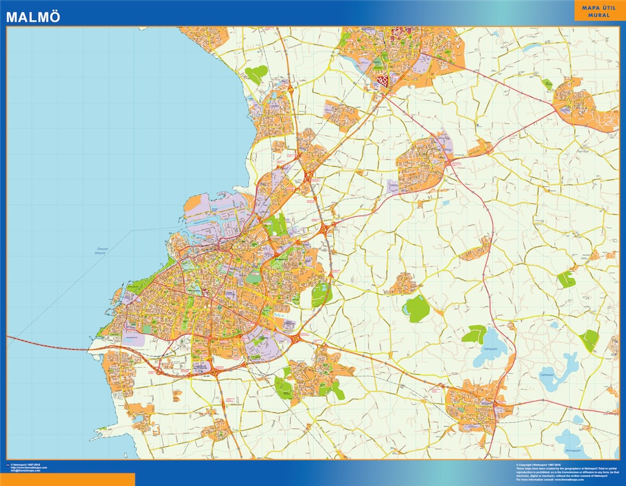 Mapa de Malmo en Suecia. El mapa se imprime en papel FOTOGRÁFICO especial de cartografía de 200 grs, y se envía, gratis, a la península y Baleares, en un tubo de cartón. Dispone de diversos acabados que puede ver en las opciones de compra del mapa.