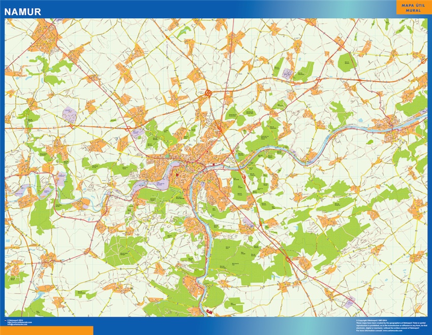 Mapa de Namur en Bélgica. El mapa se imprime en papel FOTOGRÁFICO especial de cartografía de 200 grs, y se envía, gratis, a la península y Baleares, en un tubo de cartón. Dispone de diversos acabados que puede ver en las opciones de compra del mapa.