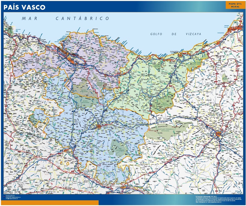 Mapa de Pais Vasco. El mapa se imprime en papel FOTOGRÁFICO especial de cartografía de 200 grs, y se envía, gratis, a la península y Baleares, en un tubo de cartón. Dispone de diversos acabados que puede ver en las opciones de compra del mapa.