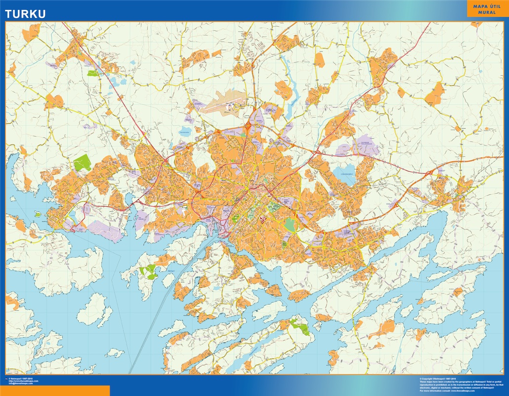 Mapa de Turku en Finlandia. El mapa se imprime en papel FOTOGRÁFICO especial de cartografía de 200 grs, y se envía, gratis, a la península y Baleares, en un tubo de cartón. Dispone de diversos acabados que puede ver en las opciones de compra del mapa.