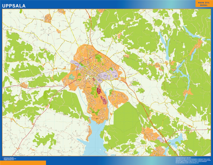Mapa de Uppsala en Suecia. El mapa se imprime en papel FOTOGRÁFICO especial de cartografía de 200 grs, y se envía, gratis, a la península y Baleares, en un tubo de cartón. Dispone de diversos acabados que puede ver en las opciones de compra del mapa.