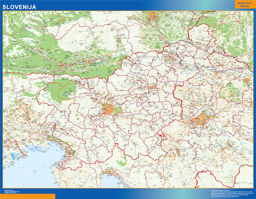 Mapa Eslovenia gigante para pared. Tamaño del mapa es 150 cm en su lado más corto. El otro lado del mapa es proporcional mayor. Es el mapa más grande del mercado en una pieza.