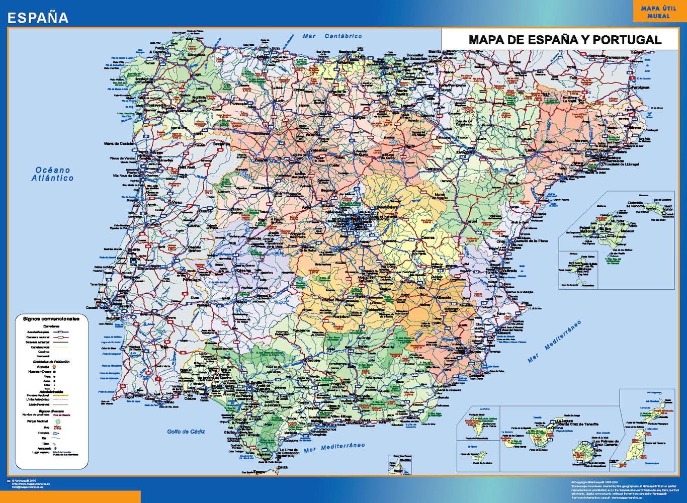 Mapa España simple. El mapa se imprime en papel FOTOGRÁFICO especial de cartografía de 200 grs, y se envía, gratis, a la península y Baleares, en un tubo de cartón. Dispone de diversos acabados que puede ver en las opciones de compra del mapa.