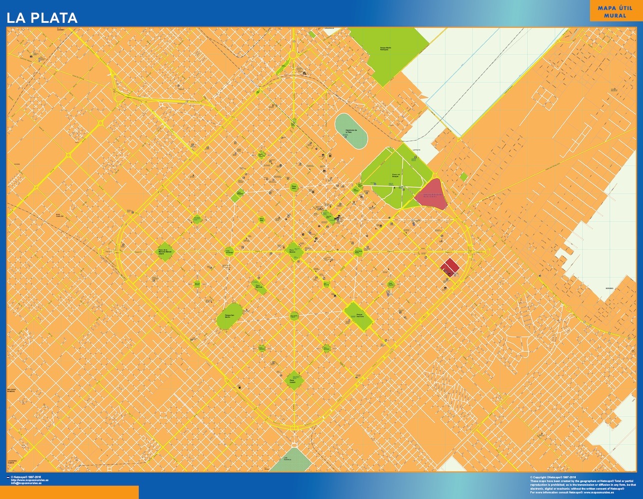 Mapa La Plata en Argentina. El mapa se imprime en papel FOTOGRÁFICO especial de cartografía de 200 grs, y se envía, gratis, a la península y Baleares, en un tubo de cartón. Dispone de diversos acabados que puede ver en las opciones de compra del mapa.
