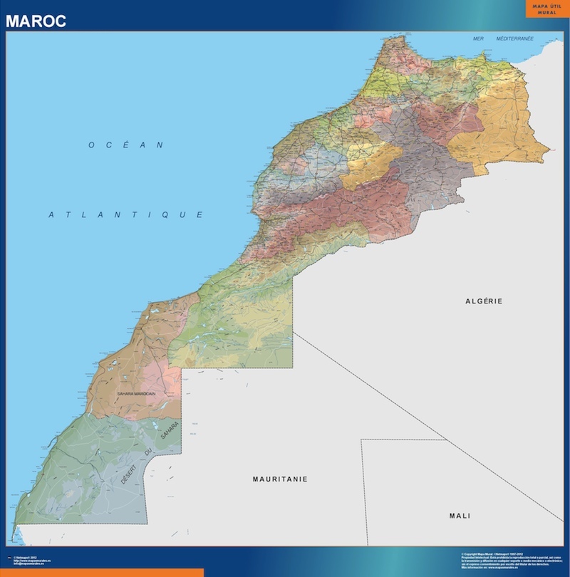 Mapa Marruecos. El mapa se imprime en papel FOTOGRÁFICO especial de cartografía de 200 grs, y se envía, gratis, a la península y Baleares, en un tubo de cartón. Dispone de diversos acabados que puede ver en las opciones de compra del mapa.