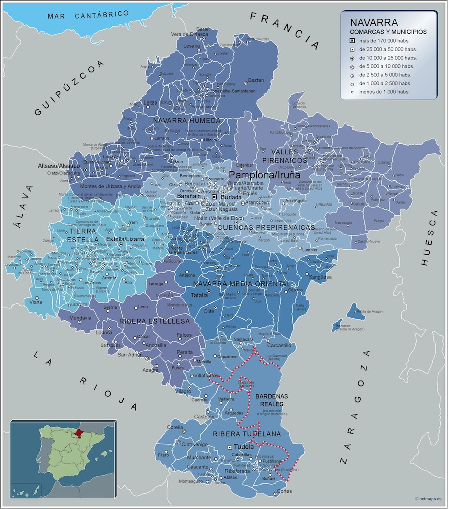 Mapa Navarra por municipios. El mapa se imprime en papel FOTOGRÁFICO especial de cartografía de 200 grs, y se envía, gratis, a la península y Baleares, en un tubo de cartón. Dispone de diversos acabados que puede ver en las opciones de compra del mapa.