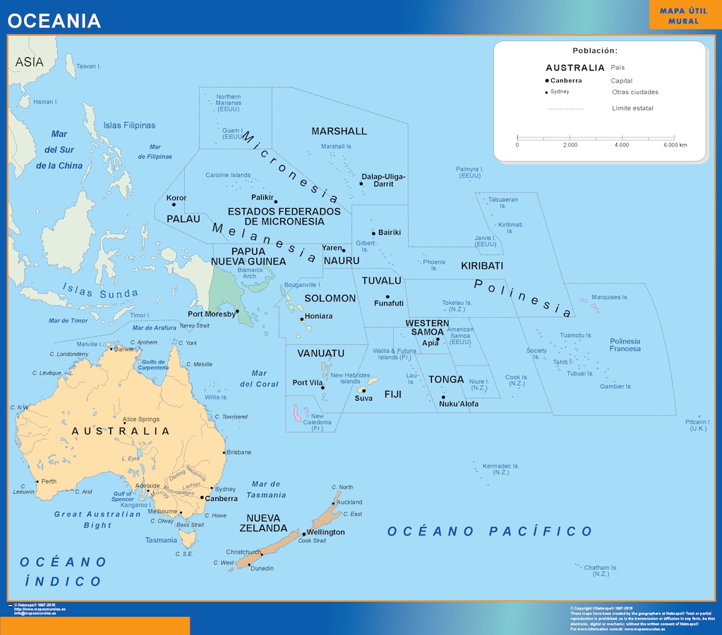 Mapa Oceania. El mapa se imprime en papel FOTOGRÁFICO especial de cartografía de 200 grs, y se envía, gratis, a la península y Baleares, en un tubo de cartón. Dispone de diversos acabados que puede ver en las opciones de compra del mapa.