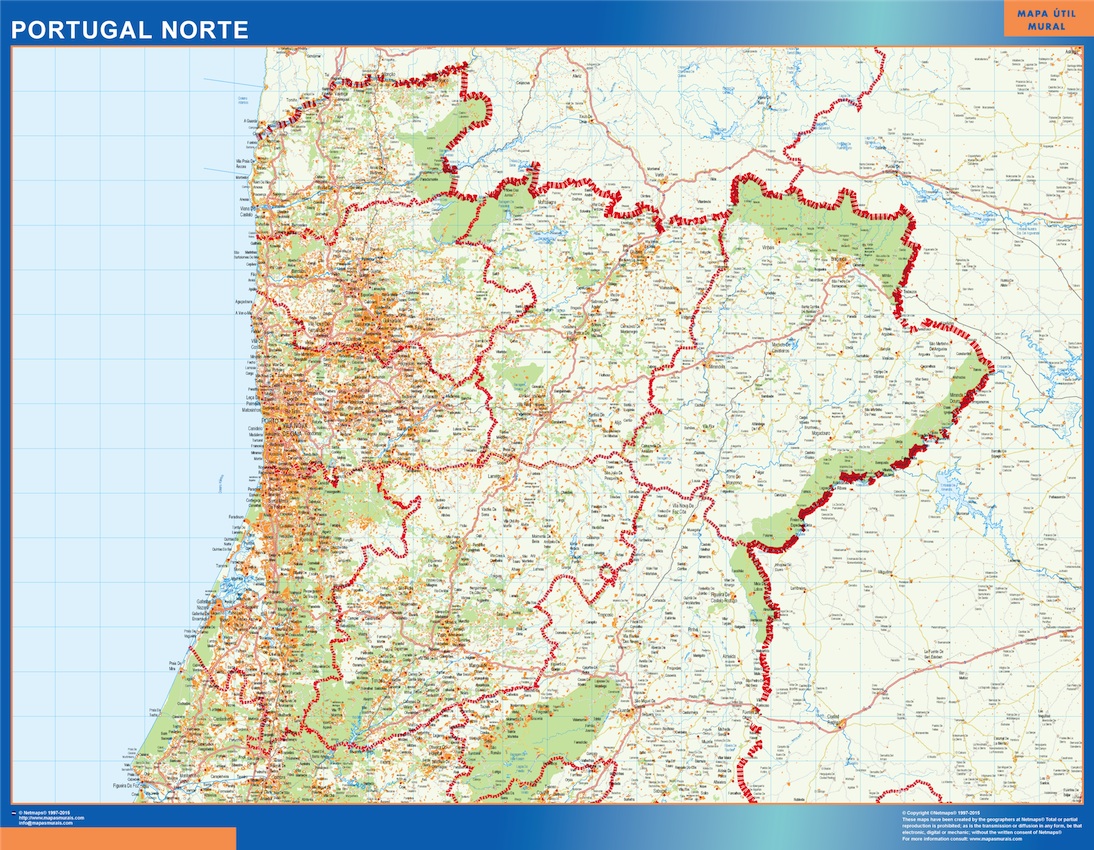 Mapa Portugal norte carreteras gigante para pared. Tamaño del mapa es 150 cm en su lado más corto. El otro lado del mapa es proporcional mayor. Es el mapa más grande del mercado en una pieza.