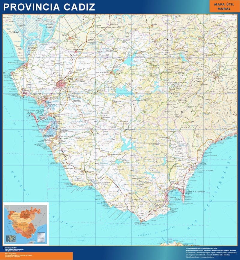 Mapa Provincia Cadiz. El mapa se imprime en papel especial de cartografía, y se envía, gratis, a la península y Baleares, en un tubo de cartón. Dispone de diversos acabados que puede ver en las opciones de compra del mapa.