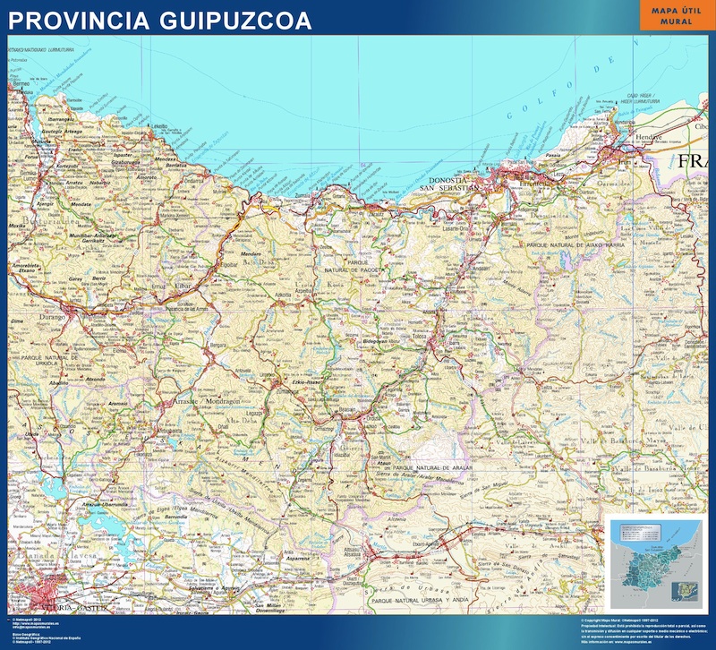 Mapa Provincia Guipuzcoa. El mapa se imprime en papel FOTOGRÁFICO especial de cartografía de 200 grs, y se envía, gratis, a la península y Baleares, en un tubo de cartón. Dispone de diversos acabados que puede ver en las opciones de compra del mapa.