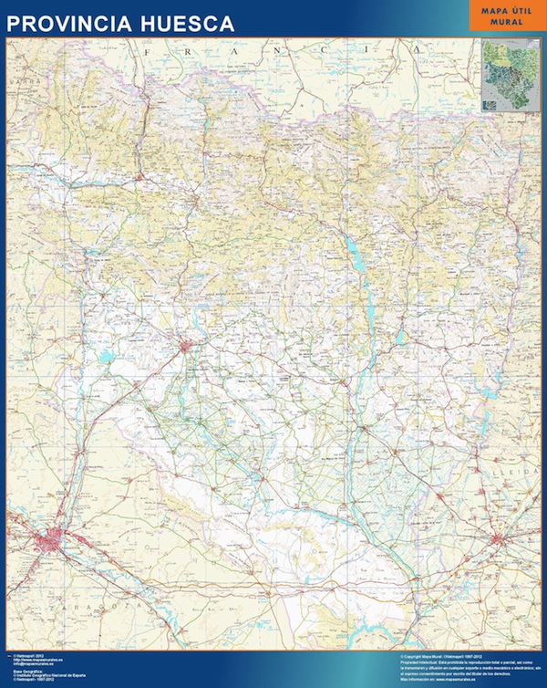 Mapa Provincia Huesca gigante para pared. Tamaño del mapa es 150 cm en su lado más corto. El otro lado del mapa es proporcional mayor. Es el mapa más grande del mercado en una pieza.