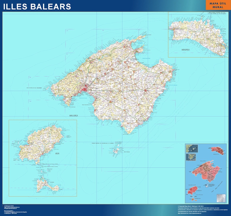 Mapa Provincia Islas Baleares gigante para pared. Tamaño del mapa es 150 cm en su lado más corto. El otro lado del mapa es proporcional mayor. Es el mapa más grande del mercado en una pieza.