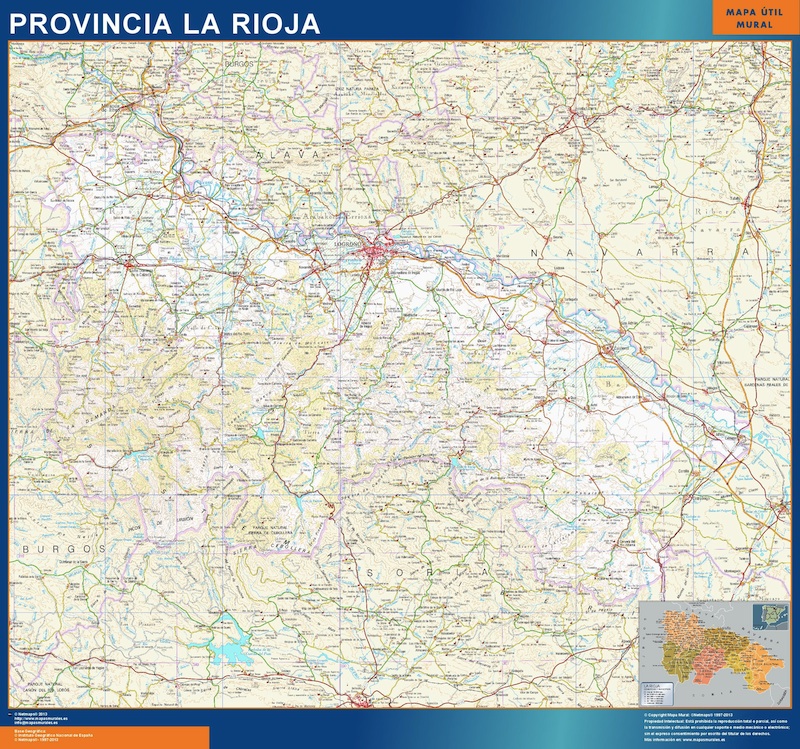 Mapa Provincia La Rioja. El mapa se imprime en papel especial de cartografía, y se envía, gratis, a la península y Baleares, en un tubo de cartón. Dispone de diversos acabados que puede ver en las opciones de compra del mapa.