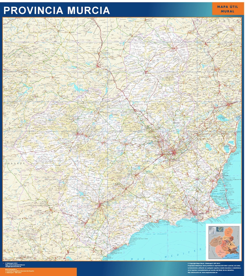 Mapa Provincia Murcia. El mapa se imprime en papel especial de cartografía, y se envía, gratis, a la península y Baleares, en un tubo de cartón. Dispone de diversos acabados que puede ver en las opciones de compra del mapa.