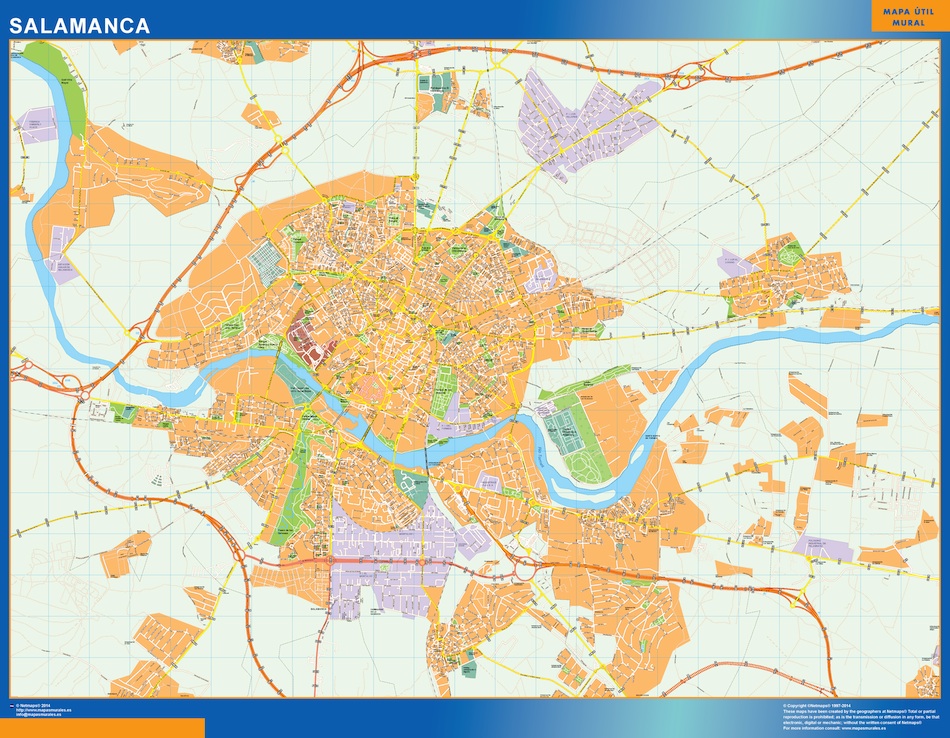 Mapa Salamanca callejero gigante para pared. Tamaño del mapa es 150 cm en su lado más corto. El otro lado del mapa es proporcional mayor. Es el mapa más grande del mercado en una pieza.