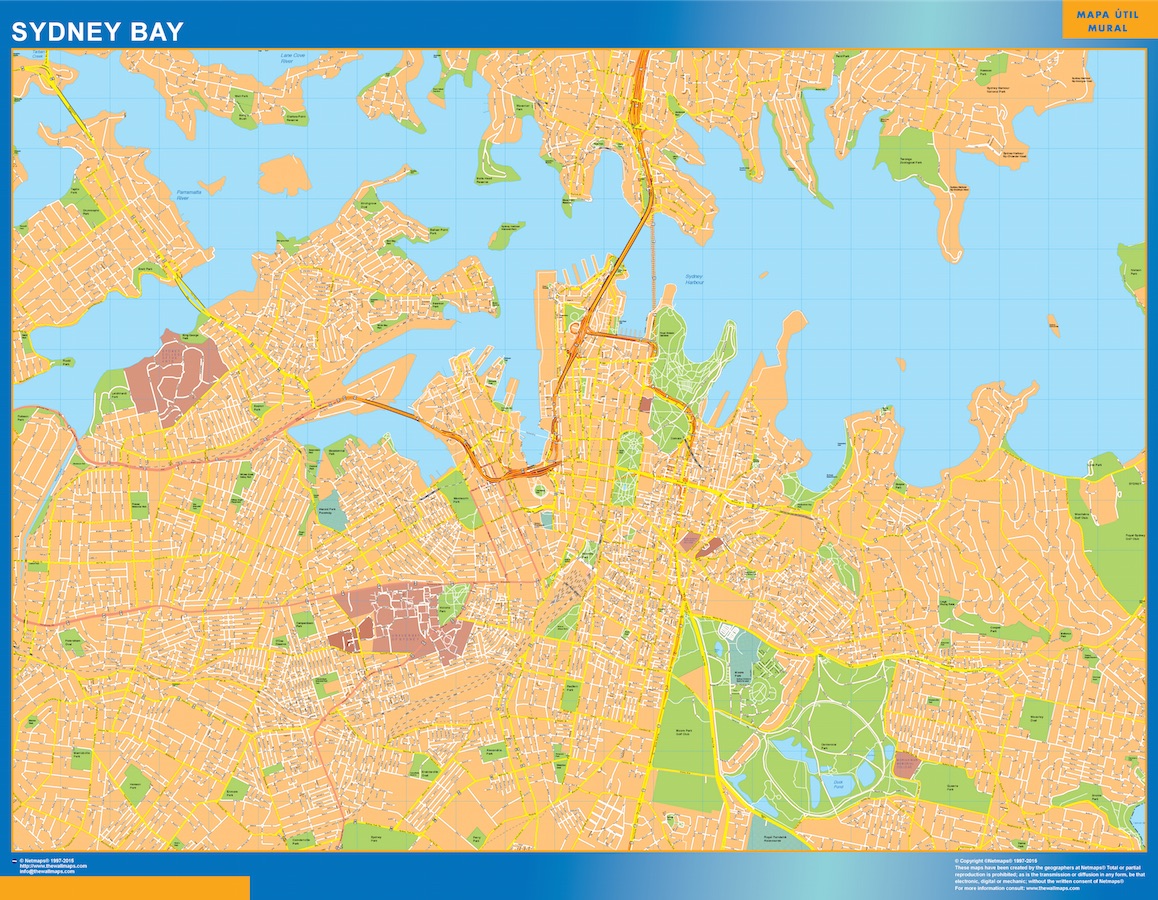Mapa Sydney Bay Australia gigante para pared. Tamaño del mapa es 150 cm en su lado más corto. El otro lado del mapa es proporcional mayor. Es el mapa más grande del mercado en una pieza.
