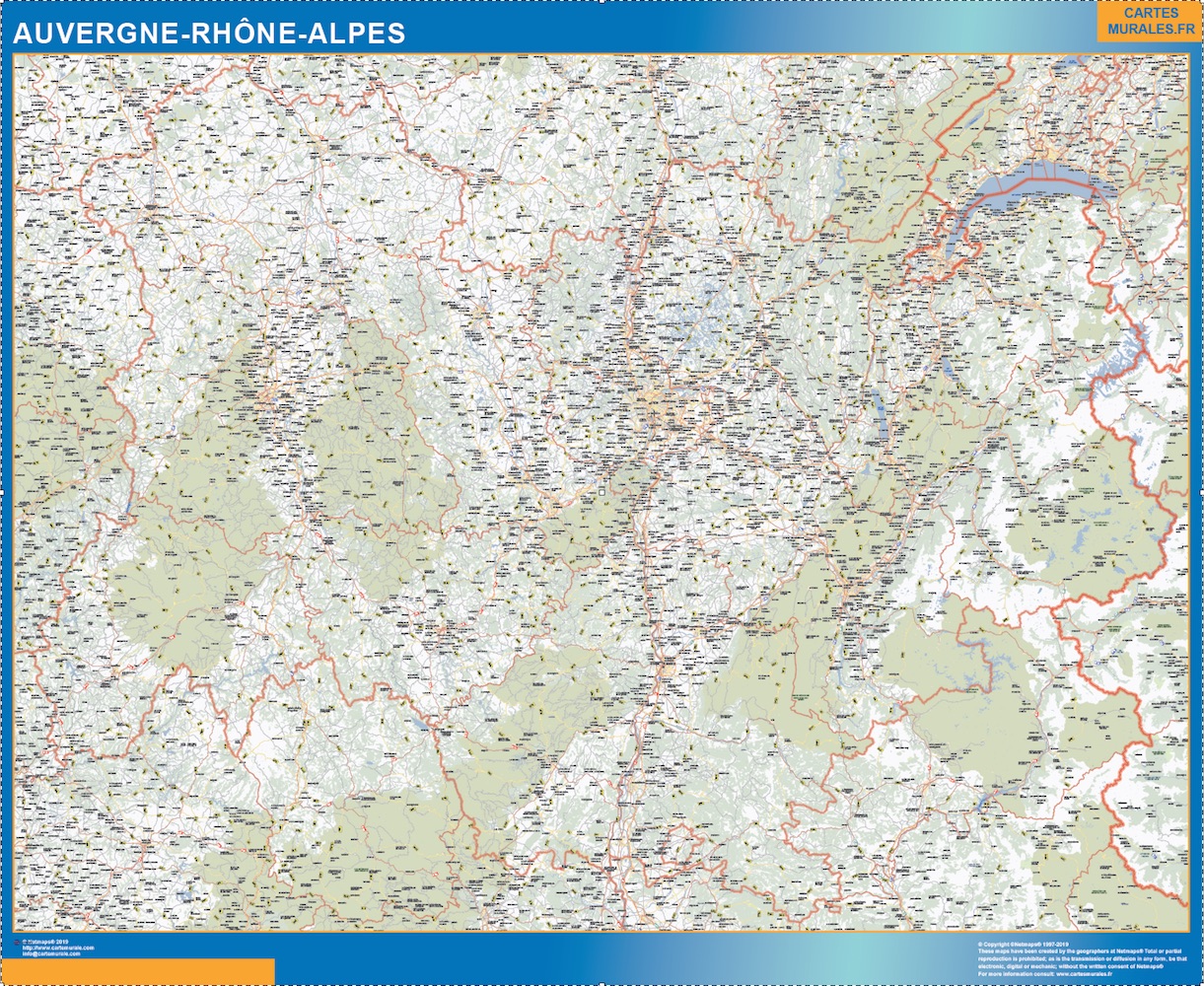 Region Auvergne-Rhone-Alpes. El mapa se imprime en papel FOTOGRÁFICO especial de cartografía de 200 grs, y se envía, gratis, a la península y Baleares, en un tubo de cartón. Dispone de diversos acabados que puede ver en las opciones de compra del mapa.